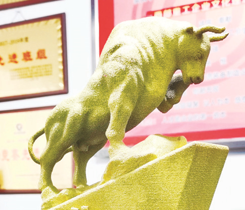 近日,西部重工公司精密鑄造分廠利用3D打印設(shè)備成功生產(chǎn)出“三牛”獎(jiǎng)杯,彰顯“牛市”動感的形象,受到職工一致好評。該廠相關(guān)技術(shù)人員以“為民服務(wù)孺子牛、創(chuàng)新發(fā)展拓荒牛、艱苦奮斗老黃牛”“三牛精神”寓意為思路,通過設(shè)計(jì)、數(shù)字建模、打印、固化、上色,成功“打印”出牛氣沖天的雕塑獎(jiǎng)杯,用于該公司年度表彰,同時(shí)具備批量化、個(gè)性化生產(chǎn)的能力?! ⊥踹M(jìn) 周永虎 攝